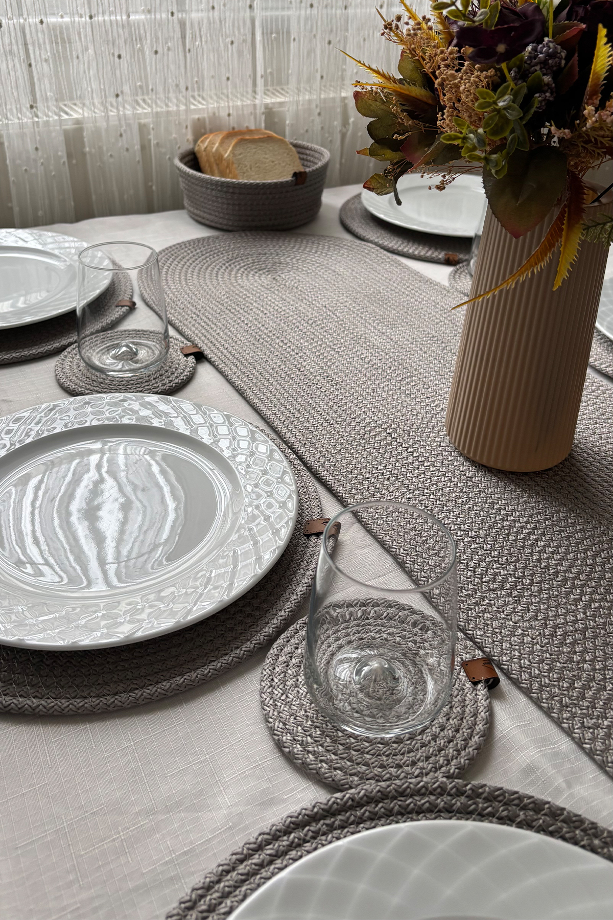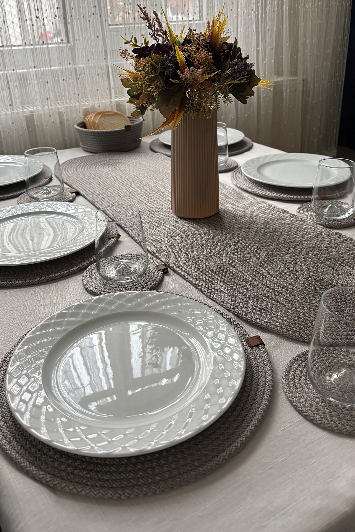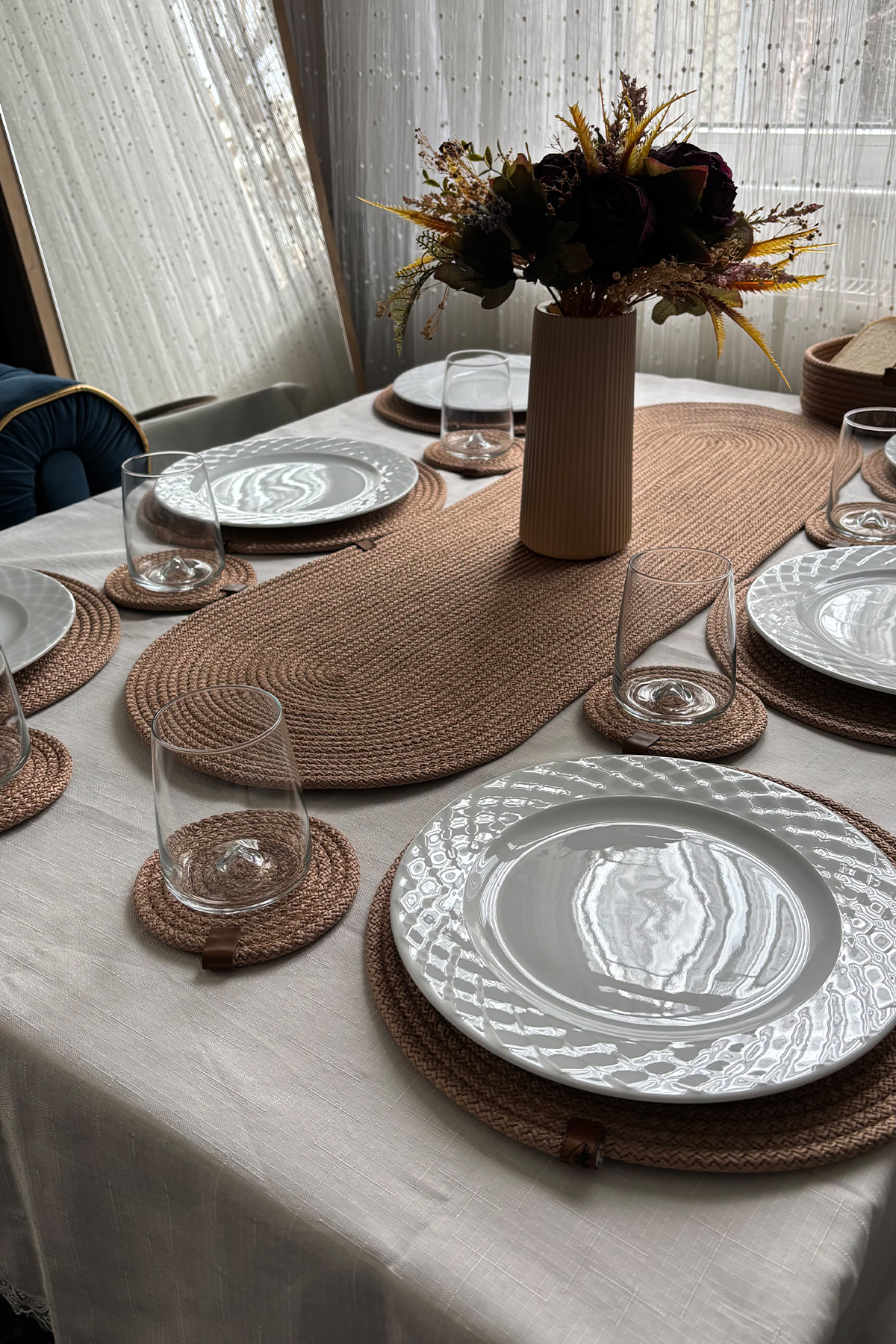 - 6 adet yuvarlak supla, 1 adet 100 x 30 cm boyutlarında runner, 6 adet bardak altlığı ve 1 Ekmek Sepeti ile tam bir set sunar