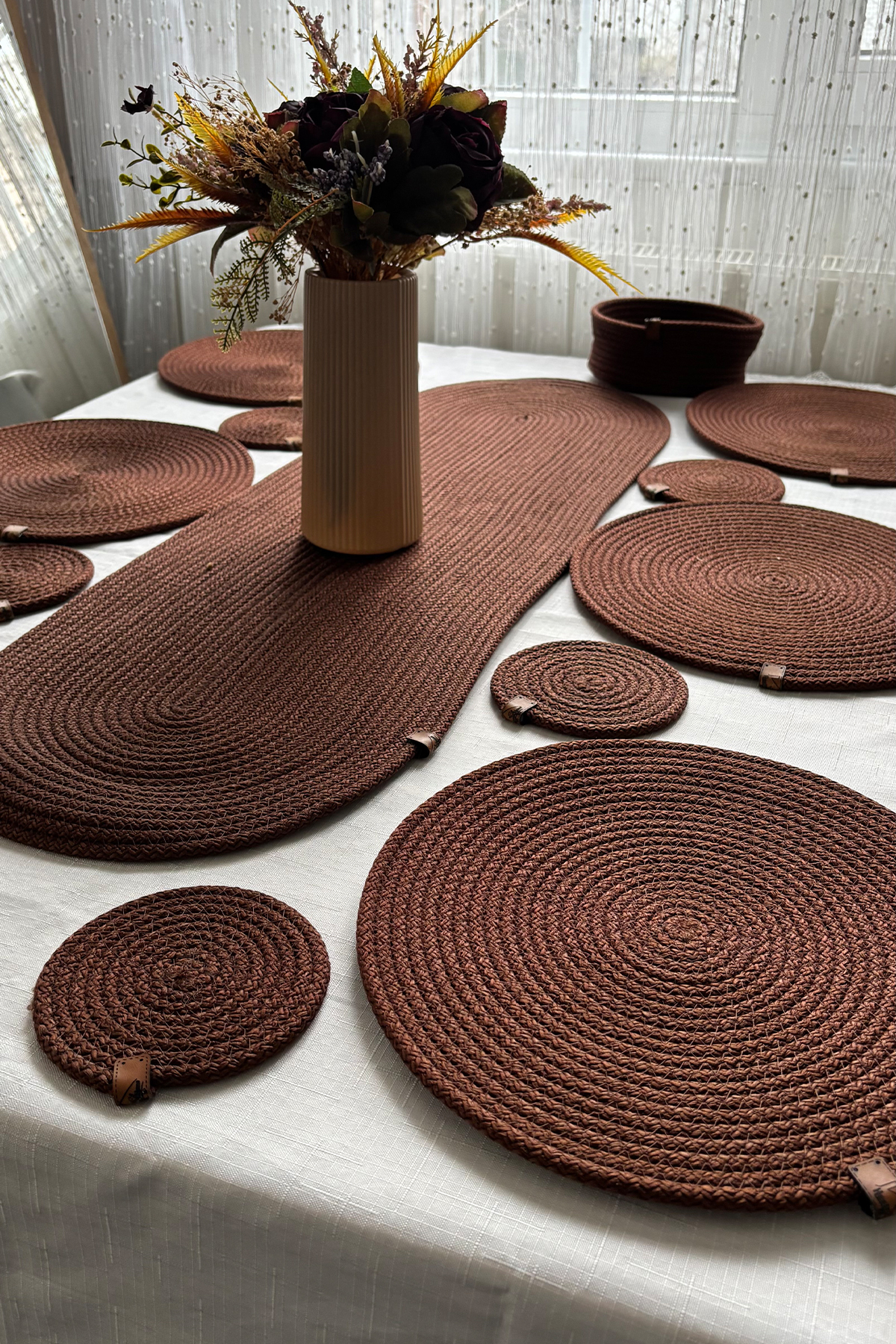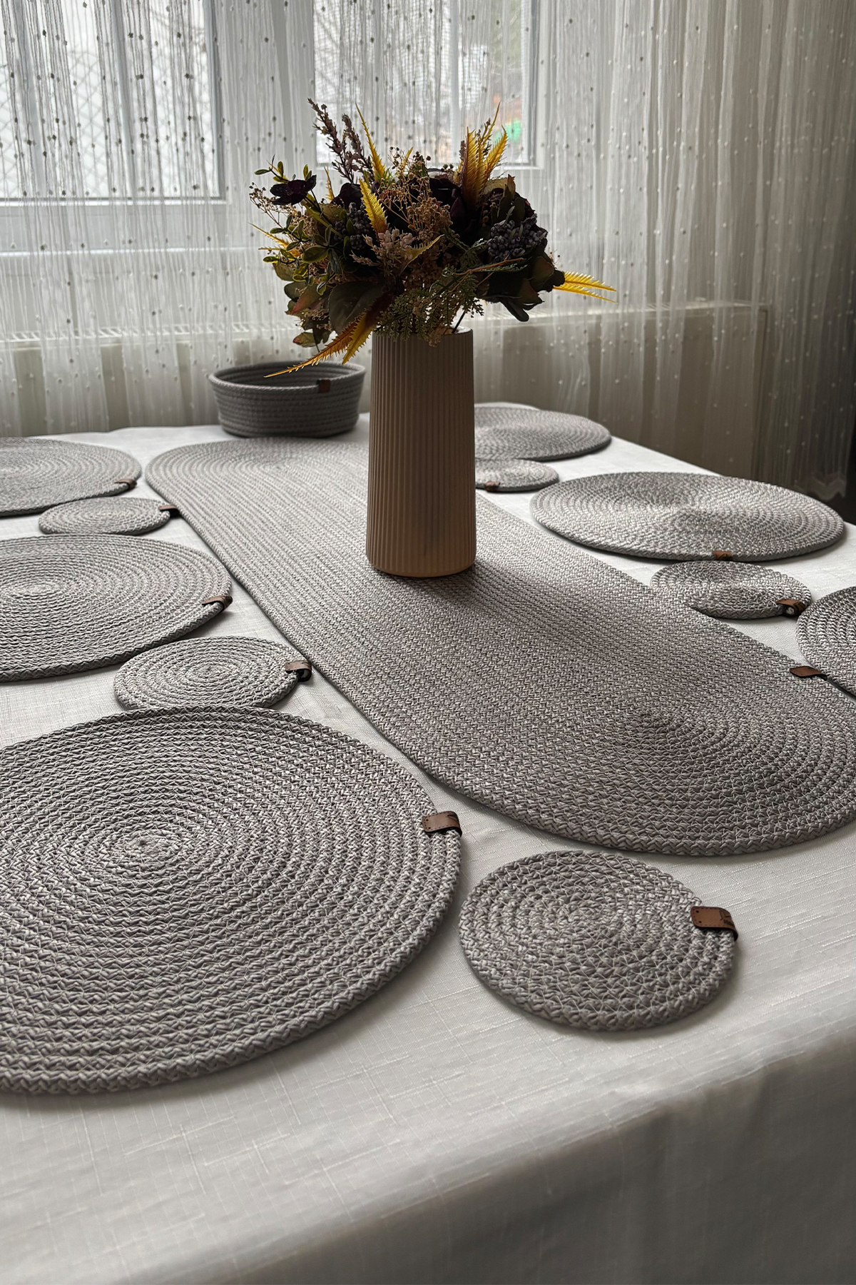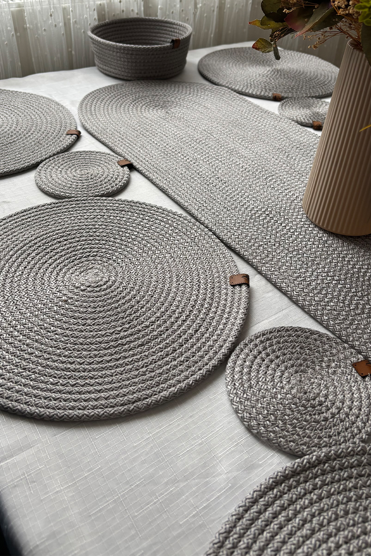 - 6 adet yuvarlak supla, 1 adet 100 x 30 cm boyutlarında runner, 6 adet bardak altlığı ve 1 Ekmek Sepeti ile tam bir set sunar