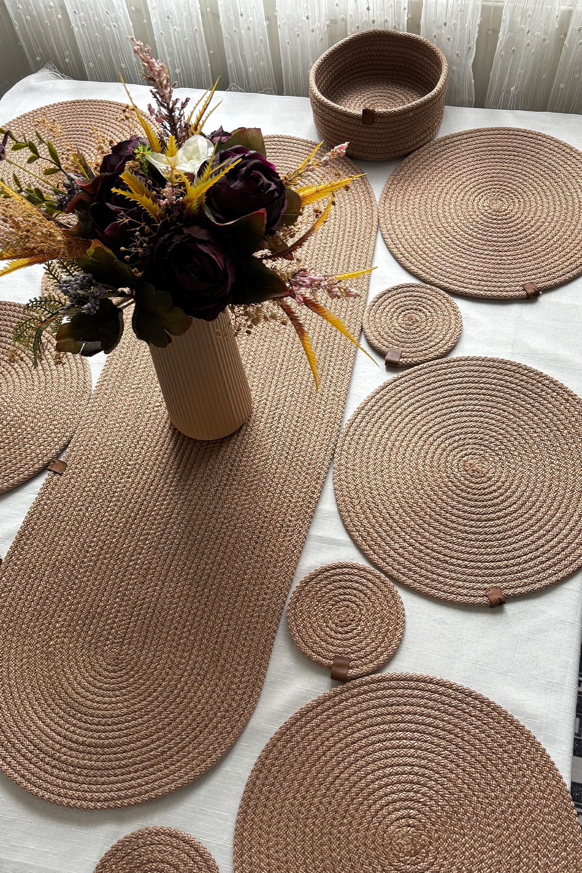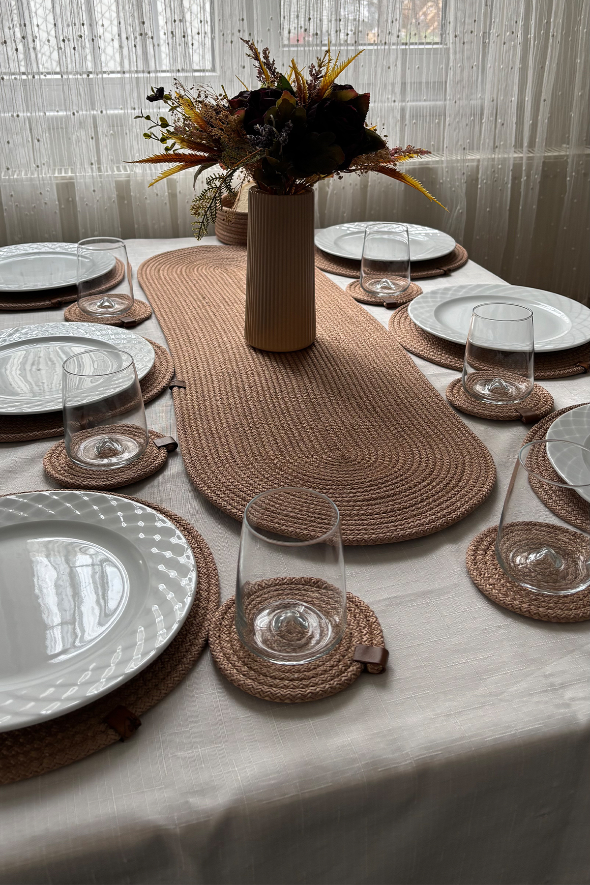 - Doğal jüt materyali ile üretilen bu set, hem dayanıklı hem de çevre dostudur